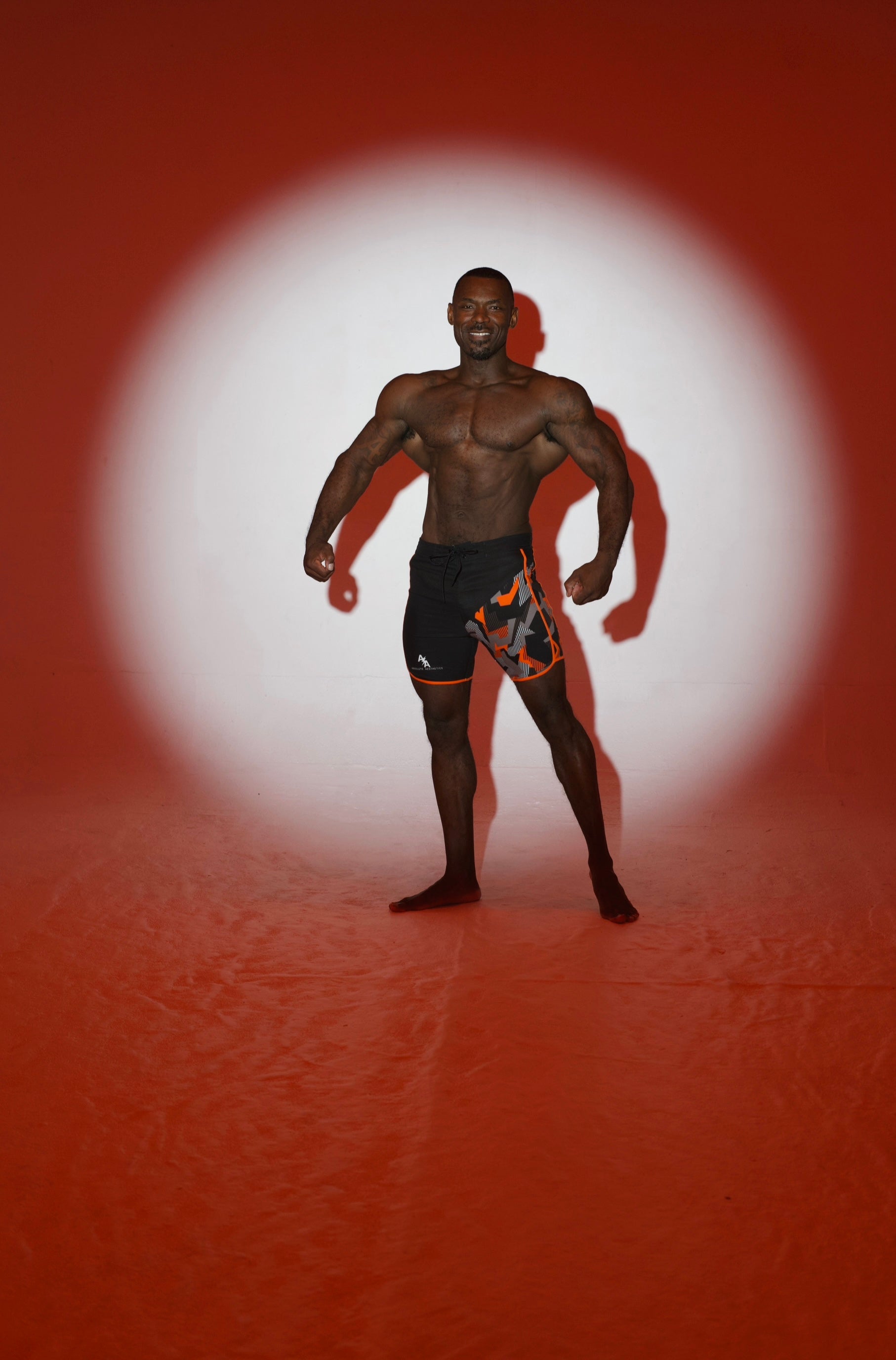 Inferno Ops brings black and blaze-orange geometric camo that pops under show lights. The athletic, above-knee cut highlights your V-taper while four-way stretch moves clean through every pose. Tan and oil-resistant fabric stays photo-ready, and the anti-roll waistband locks in comfort. Designed with NPC/IFBB standards in mind.