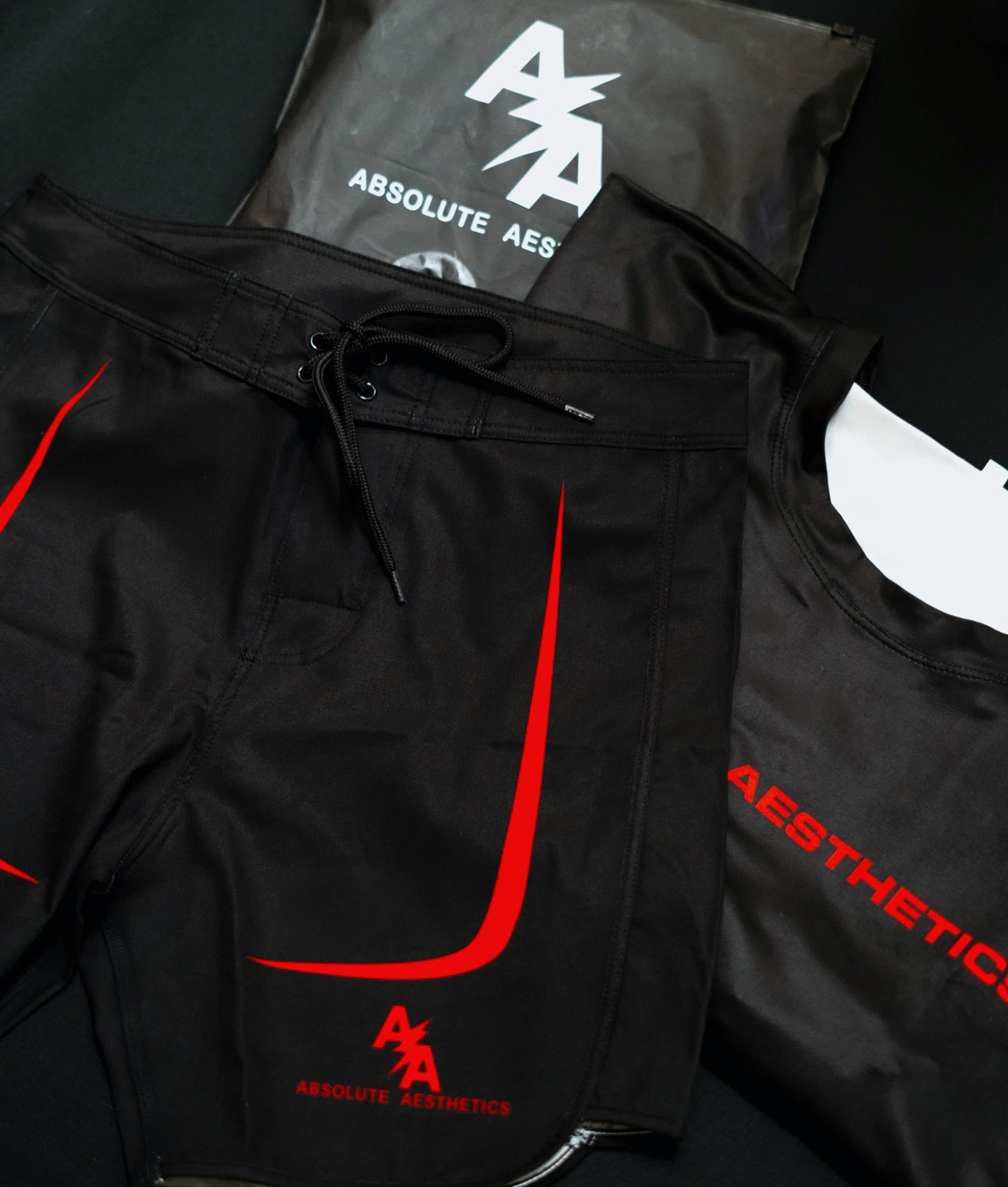 These are Rhyan Clark’s exclusive Absolute Aesthetics board shorts, the Final Callouts. Sleek all-black with a sharp red pinstripe, built for stage presence and elite aesthetics. Only 60 pairs will ever be made. Each pair comes with a signed collector’s “Baseball Card” by IFBB Pro Rhyan Clark himself.